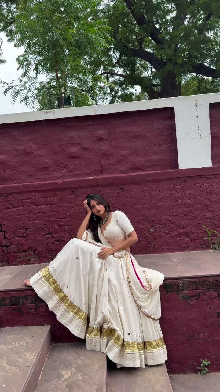The rich ivory-white base beautifully complements the shimmering mirror work detailing, reflecting light with every twirl and dance step. ๐ The golden lace borders with a pop of vibrant pink lining add a festive charm, making this outfit stand out in the colorful essence of Navratri. The blouse with its chic deep neckline brings in a modern silhouette, while the dupatta enhances the overall royal appeal with grace. ๐โจ