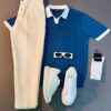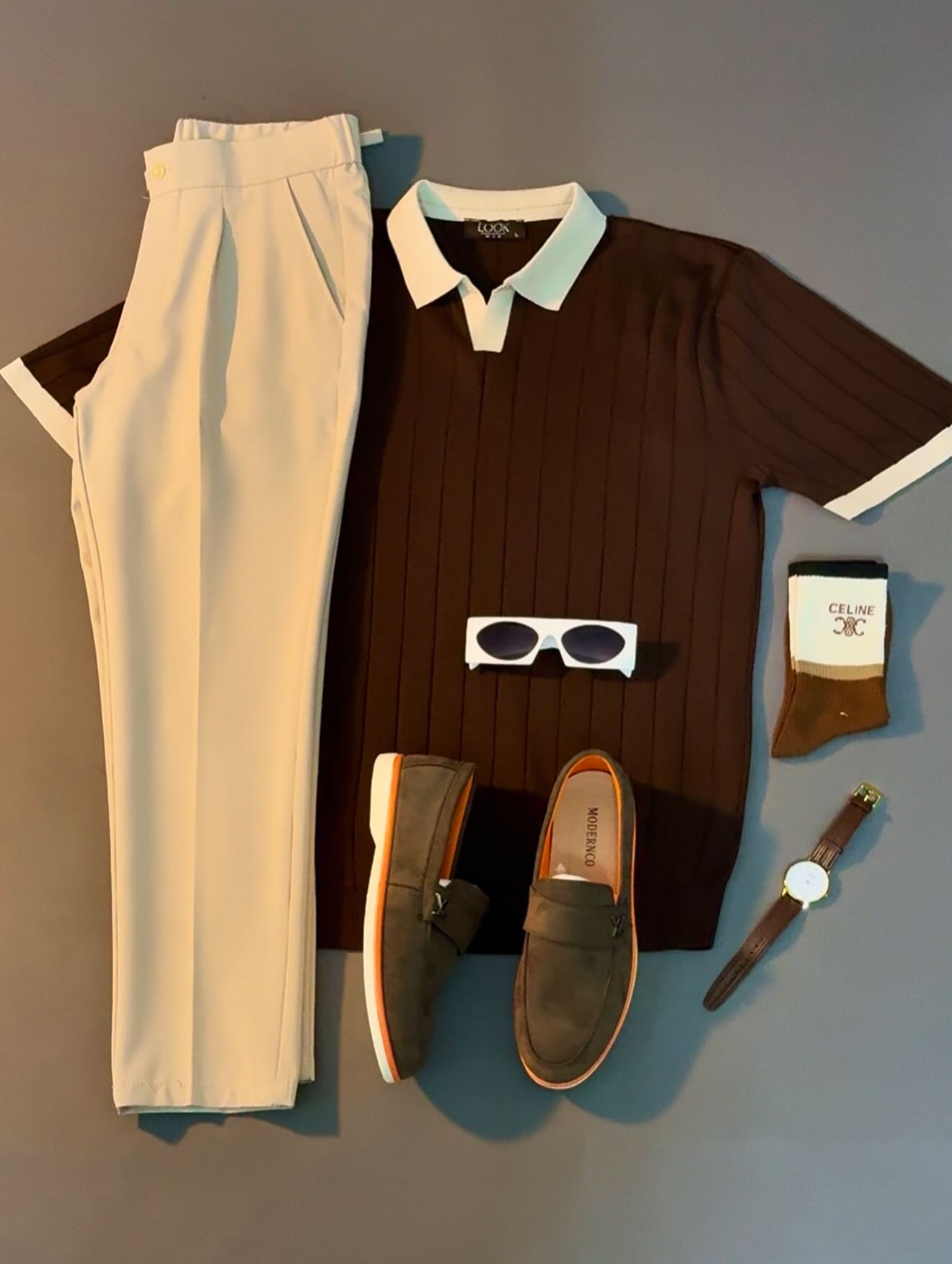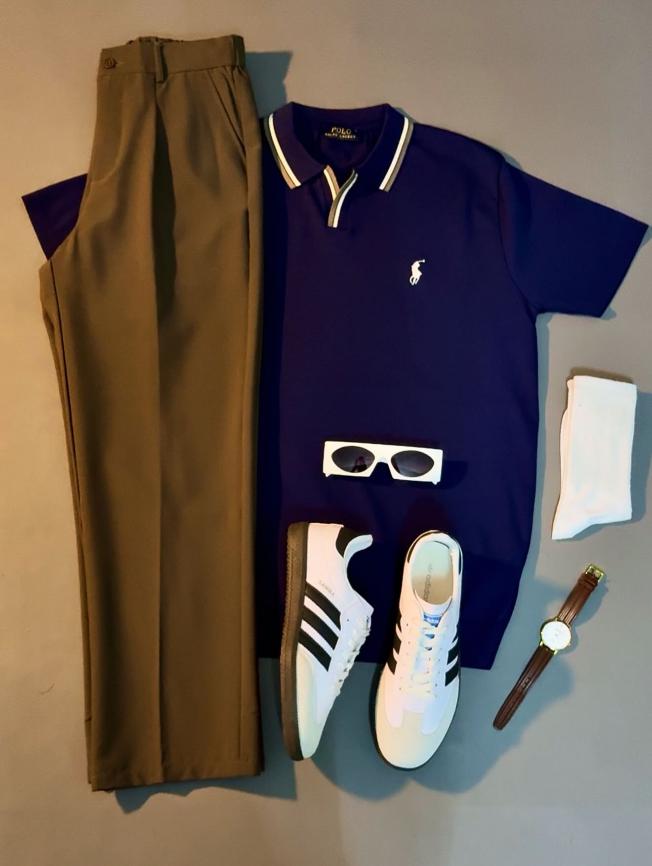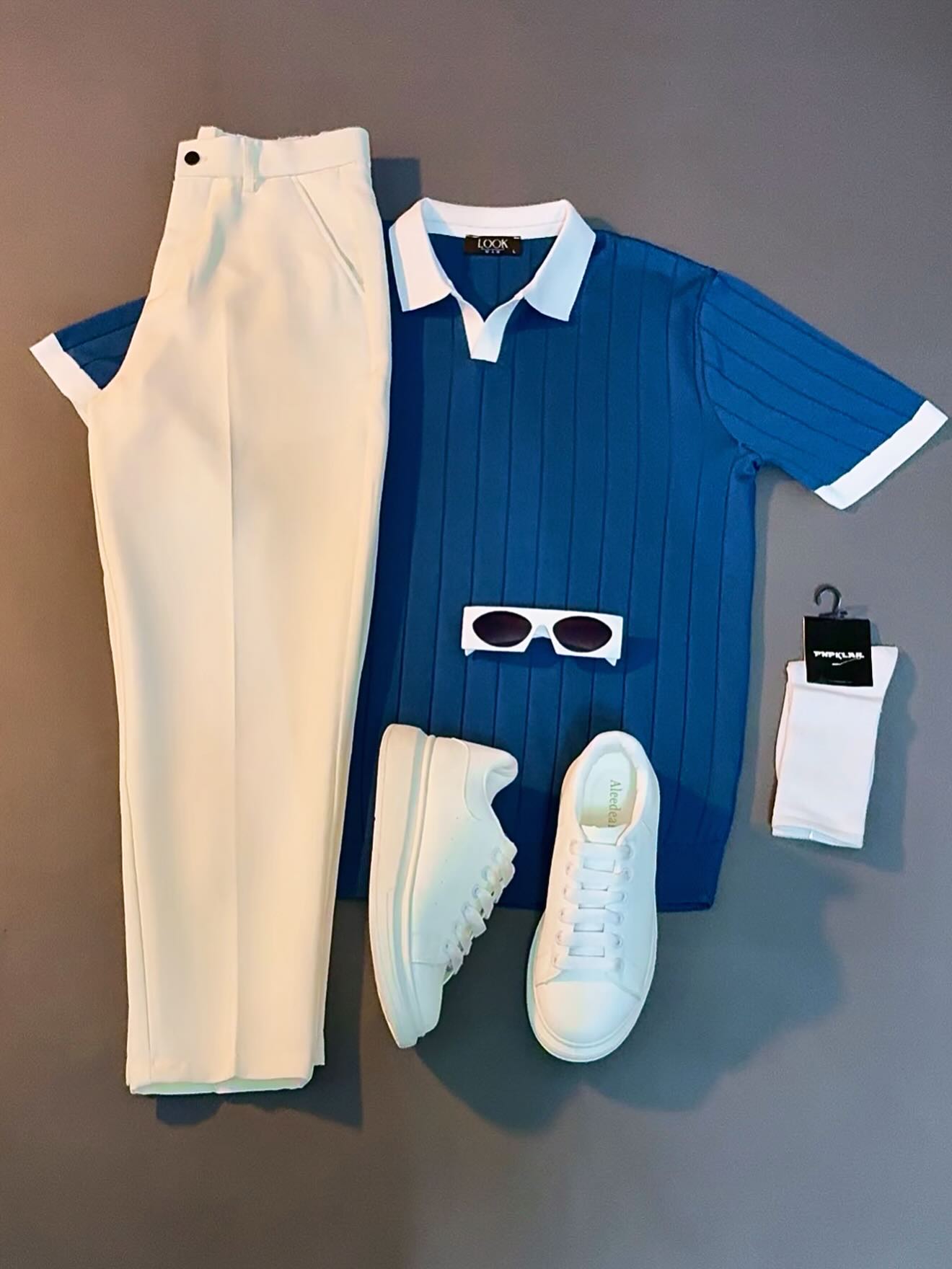 At the heart of this look is the textured blue polo t-shirt, featuring subtle vertical ribbing that adds depth and dimension to the outfit. The contrasting white collar and sleeve trims elevate the design, giving it a refined and sporty edge. It’s a perfect mix of casual comfort and polished style, making it suitable for both relaxed and semi-formal occasions. 👕✨