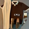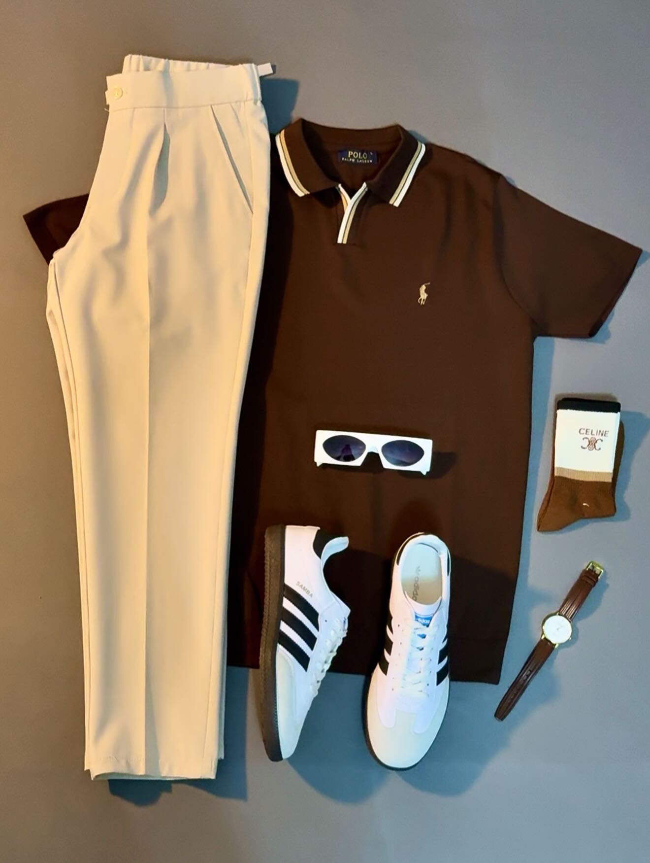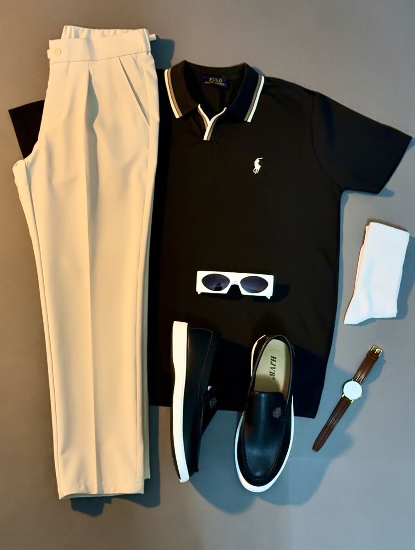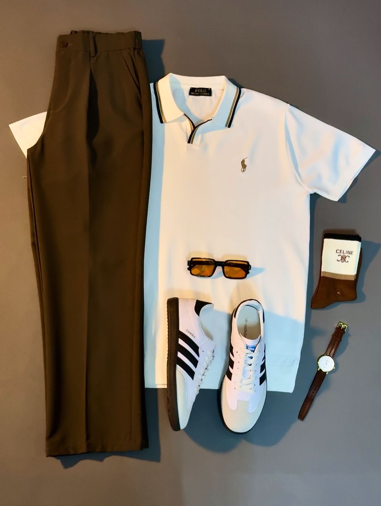 At the heart of this look is the textured blue polo t-shirt, featuring subtle vertical ribbing that adds depth and dimension to the outfit. The contrasting white collar and sleeve trims elevate the design, giving it a refined and sporty edge. It’s a perfect mix of casual comfort and polished style, making it suitable for both relaxed and semi-formal occasions. 👕✨