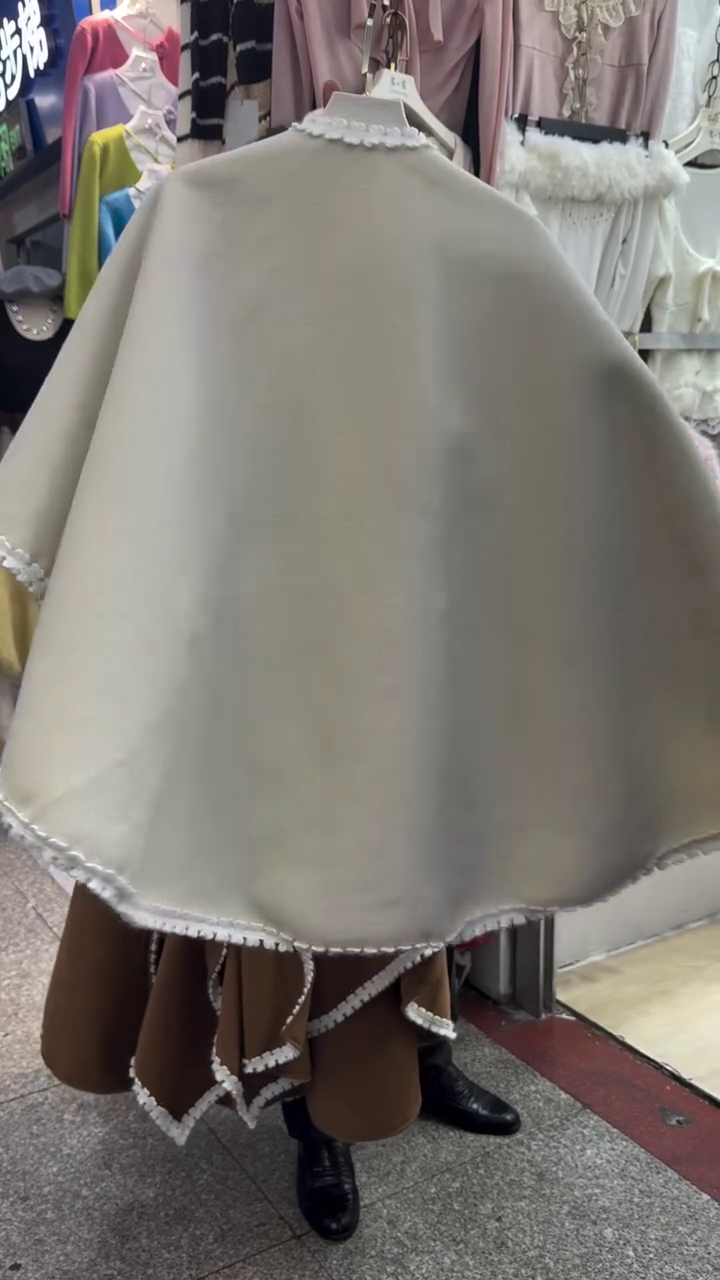 Crafted from premium soft wool-blend fabric, this cape provides an irresistibly cozy feel, keeping you warm while maintaining a refined silhouette. The flowing drape flatters every body type, while the wide belt tie cinches your waist beautifully, creating that perfect feminine shape. 💫 The delicate lace trimming along the neckline and borders adds a romantic touch, giving the piece a soft, Parisian flair that’s simply unforgettable.