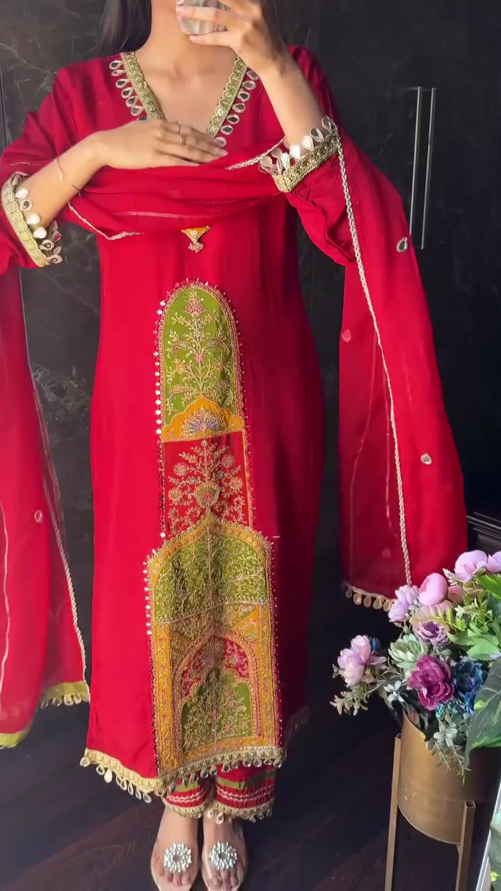 The kurta features exquisite multi-panel embroidery inspired by traditional architectural and floral motifs. A striking vertical embroidered panel runs down the front, showcasing intricate green, gold, and yellow threadwork that creates a regal contrast against the bold red fabric. The detailed craftsmanship reflects heritage artistry, making this piece feel luxurious and festive 🌿✨.