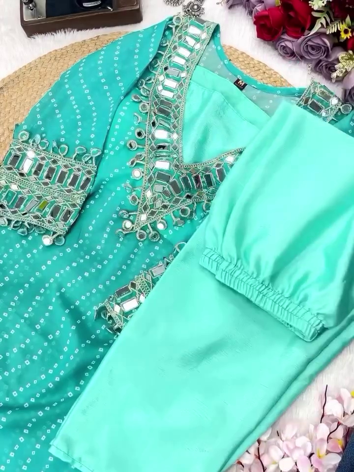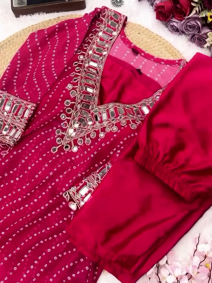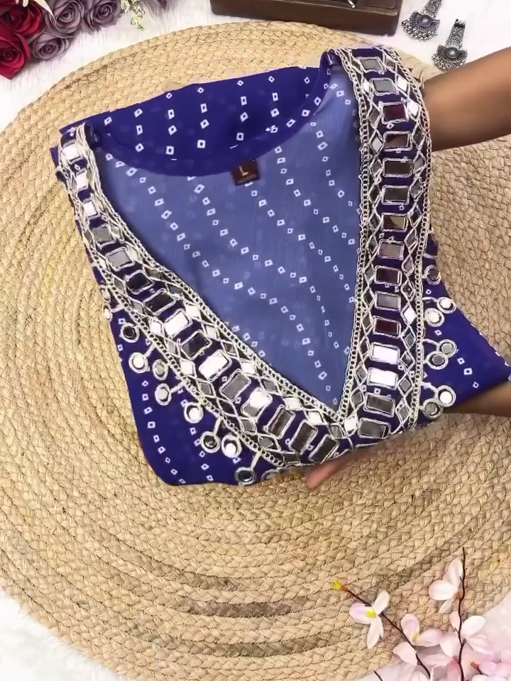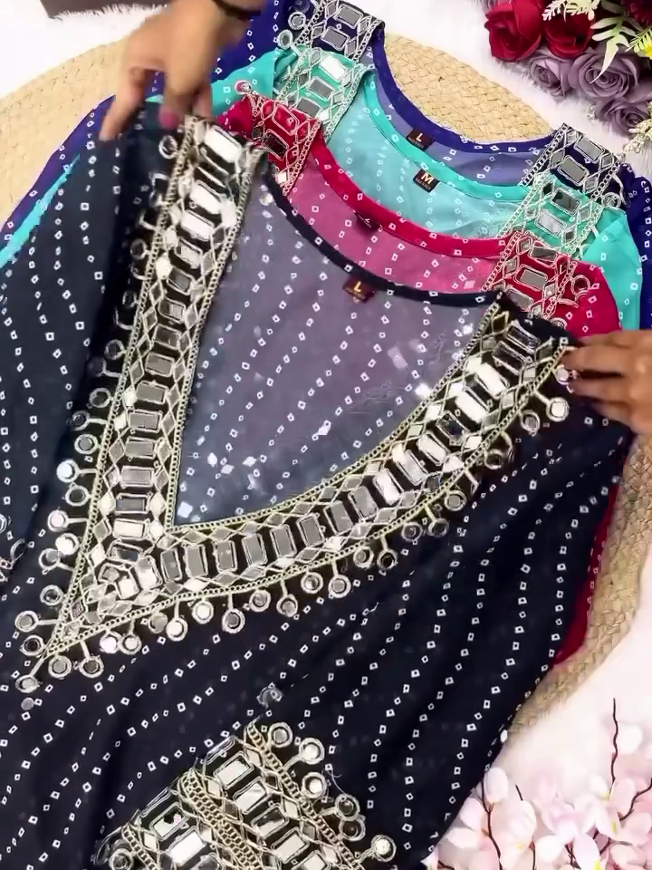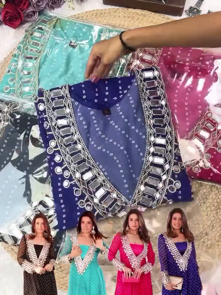 Step Into The Spotlight With Our Exquisite Designer Bandhej Mirror Work Anarkali Kurta Set, A Celebration Of Timeless Craftsmanship And Modern Elegance. Inspired By India’s Rich Textile Heritage, This Ethnic Masterpiece Blends Traditional Bandhej Patterns With Dazzling Mirror Work And Heavily Embellished Details To Offer A Regal Festive Ensemble.
