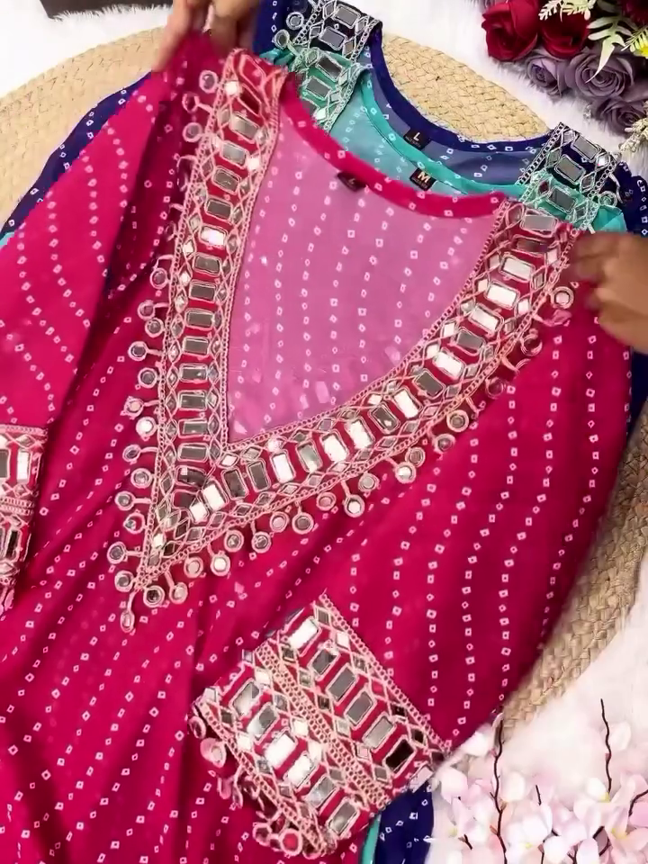 🌟 Designer Bandhej Mirror Work Anarkali Kurta Set 🌟 With Heavy Embellished Neck & Sleeve Detailing | Available In Multiple Festive Colors