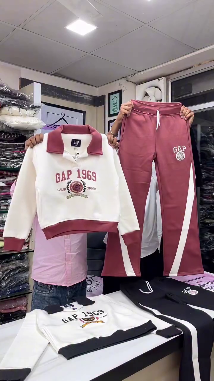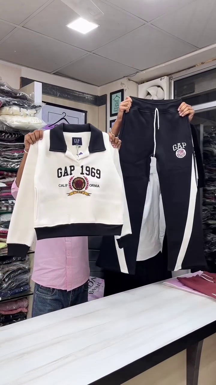 The set features a smart collared sweatshirt with a soft pullover design, highlighted by the iconic “GAP 1969 California” crest print on the front 🏫✨ The contrast collar and ribbed cuffs add a varsity-style touch, giving the outfit a classy yet casual appeal. The fabric feels plush and cozy, making it ideal for all-day wear 🌬️💫