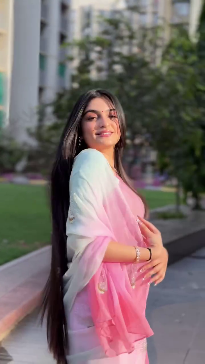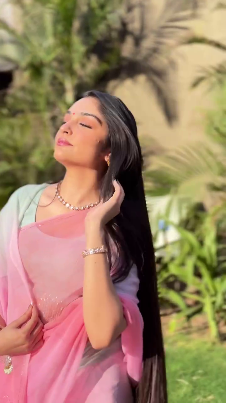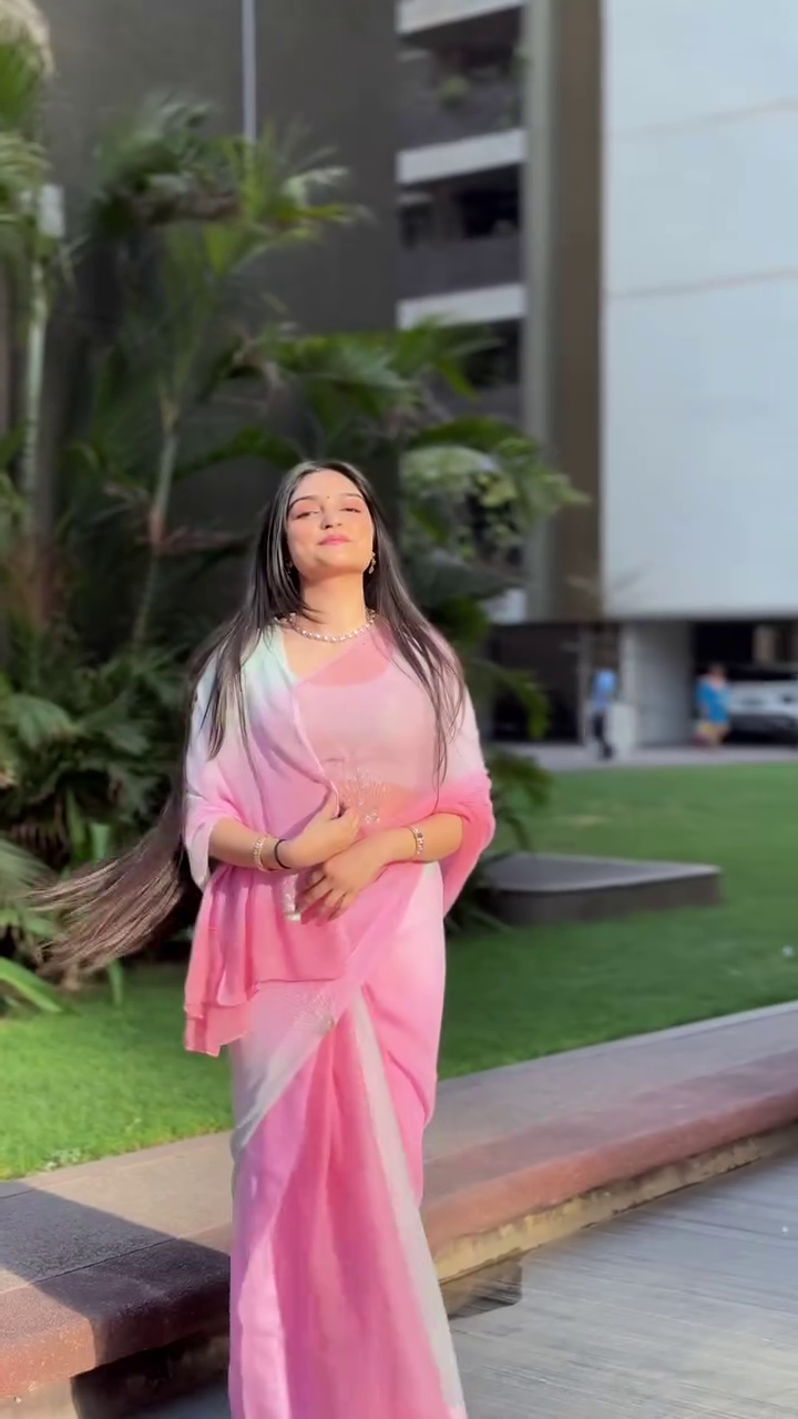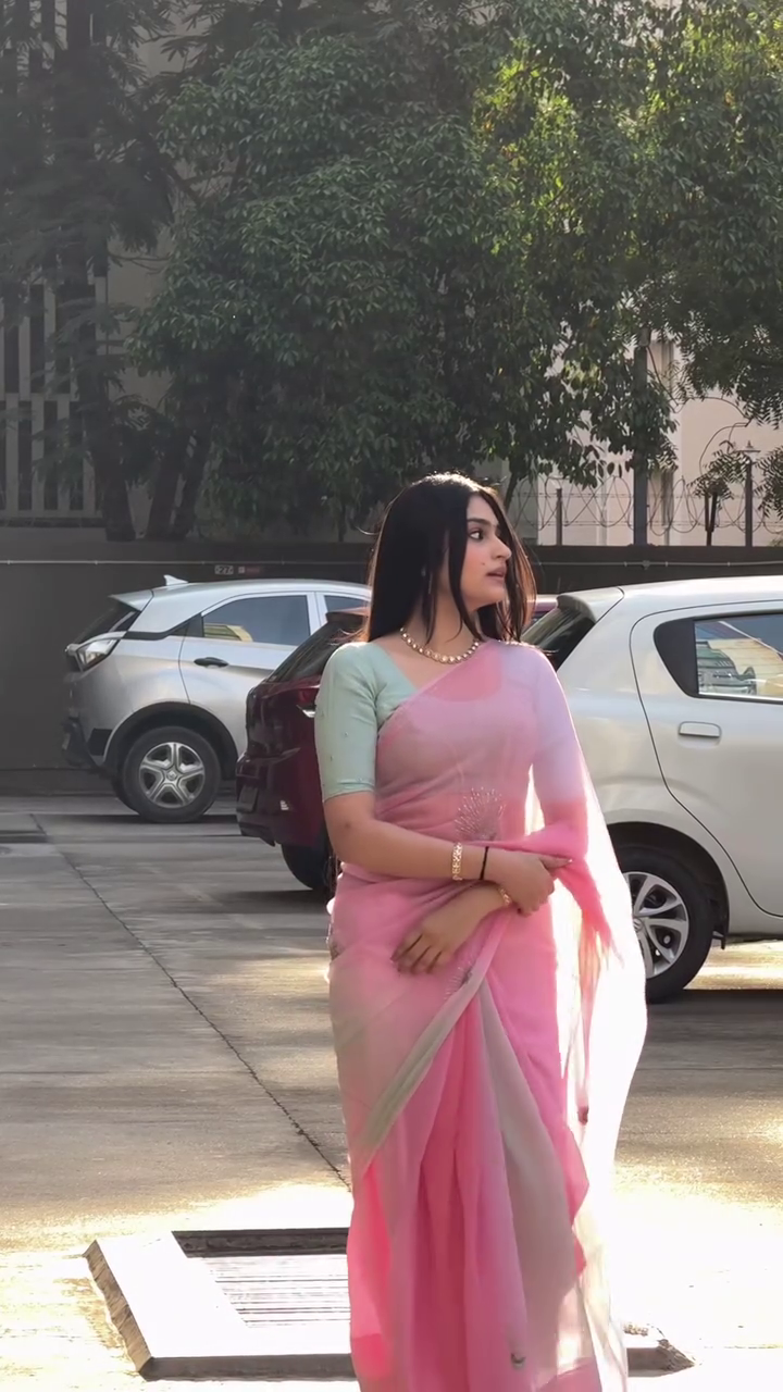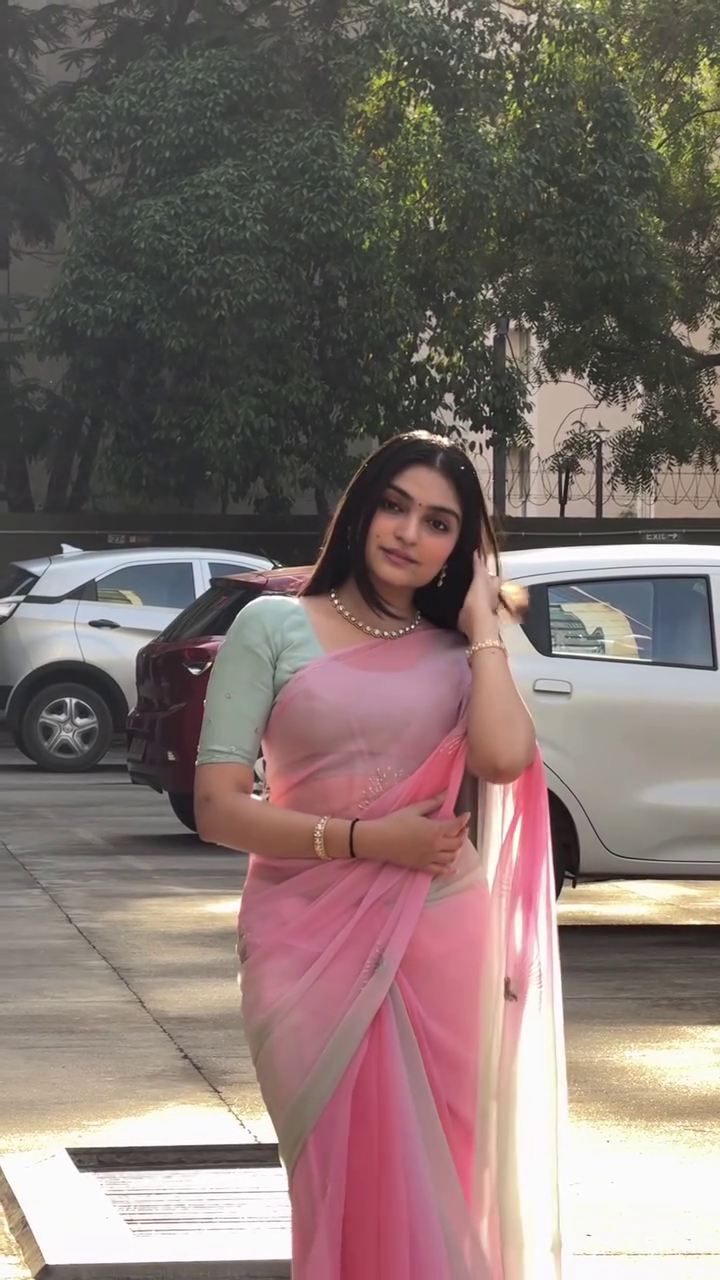 The saree features a dual-tone gradient effect, blending soft blush with hints of lighter hues, creating a dreamy, ethereal vibe. This soft play of colors makes it eye-catching yet understated, perfect for those who love elegance with a touch of minimalism. π