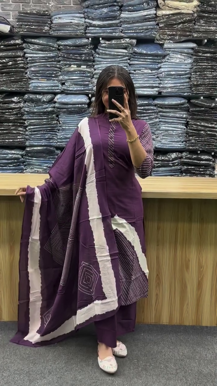 Step into a world of timeless elegance with this stunning Purple Bandhani Cotton Kurta Suit Set, designed for the modern woman who loves tradition with a contemporary twist. This ensemble is perfect for festive occasions, casual outings, or family gatherings, bringing together comfort, style, and vibrant artistry.