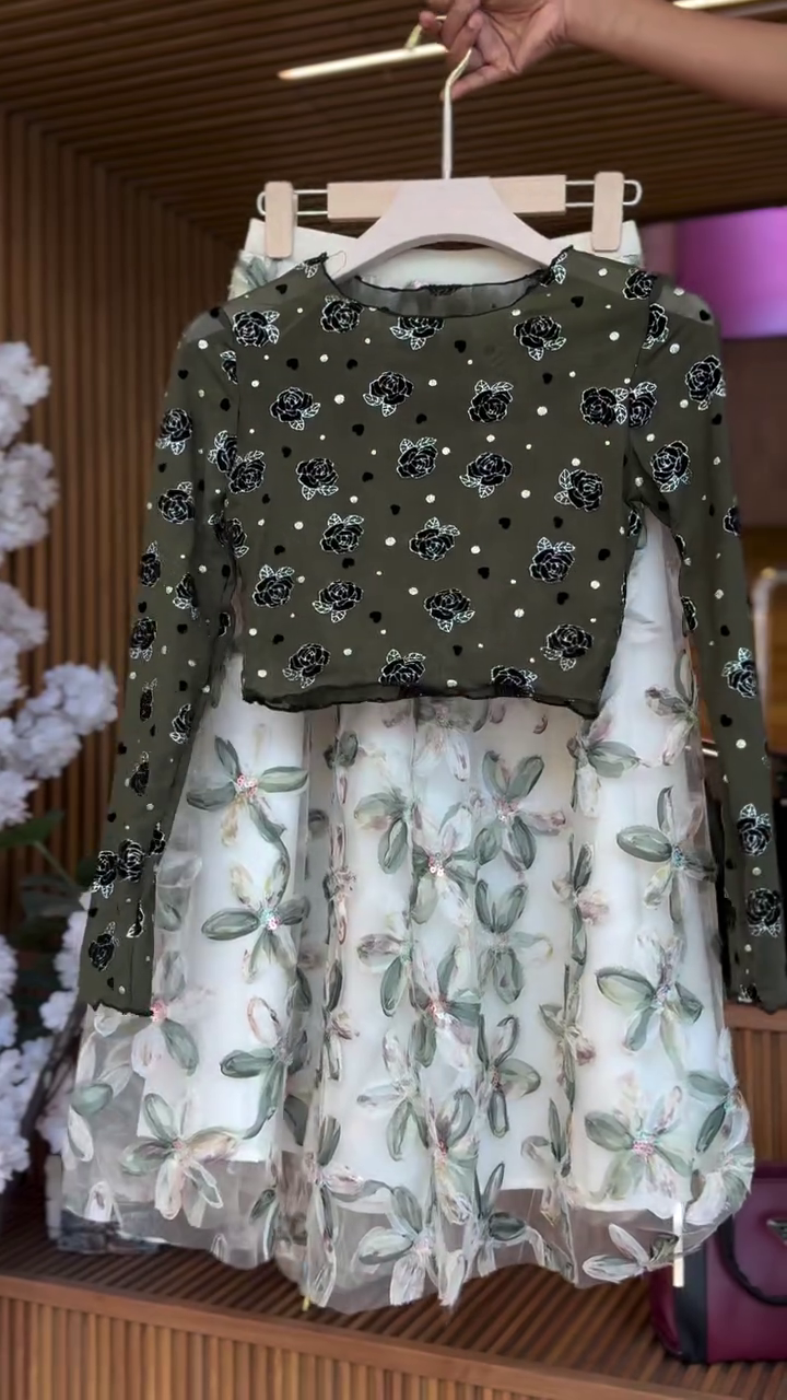 Together, the deep olive top and the airy floral skirt create a stunning contrastβbold yet delicate, structured yet flowy. This outfit is perfect for festive gatherings, daytime celebrations, garden parties, or semi-formal occasions where you want to make a refined style statement.
