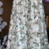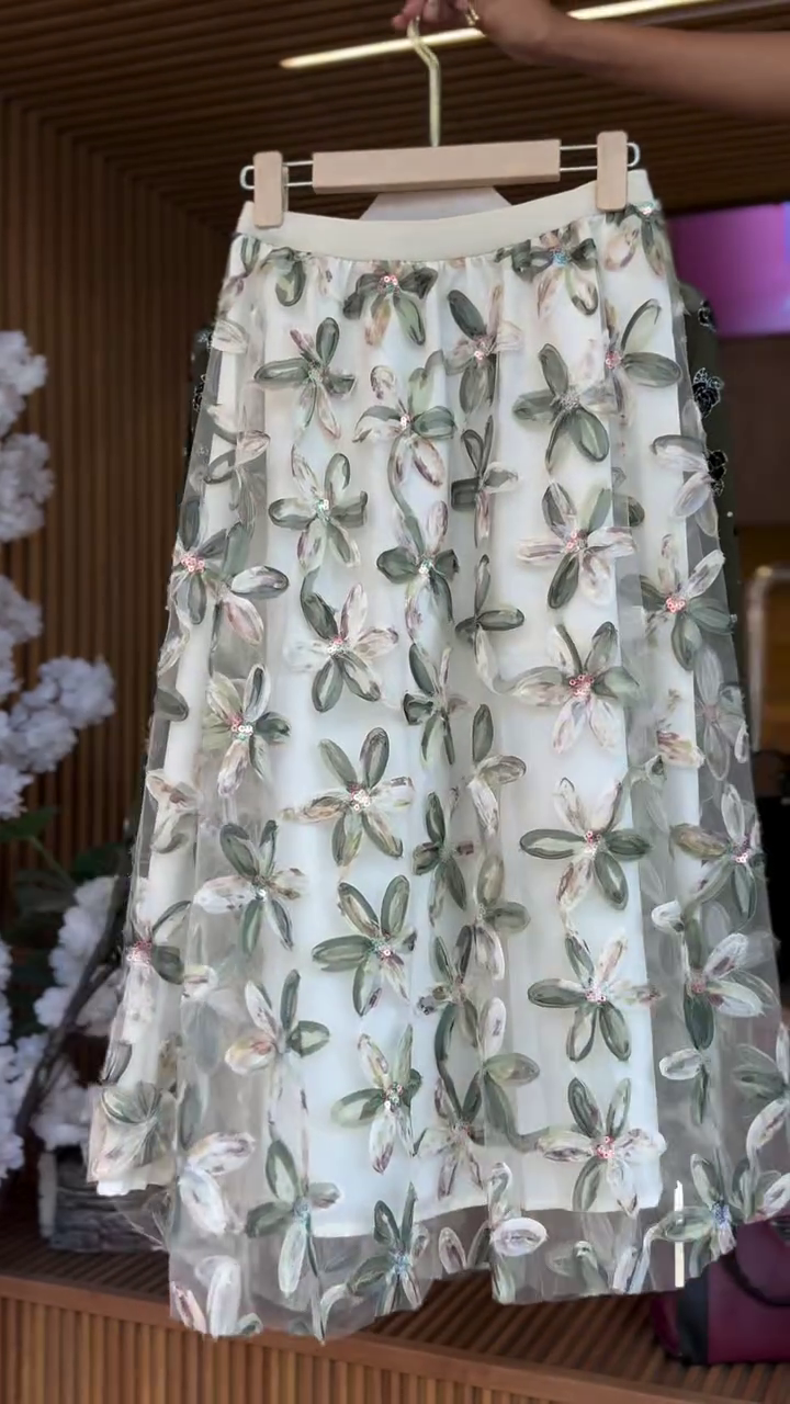 The skirt is where the magic truly unfolds. Designed in a soft ivory base, it features oversized, watercolor-inspired floral prints in muted greens and blush tones. The sheer overlay adds dimension and texture, while the gentle flare creates graceful movement with every step. The lightweight fabric ensures comfort while maintaining a sophisticated drape.