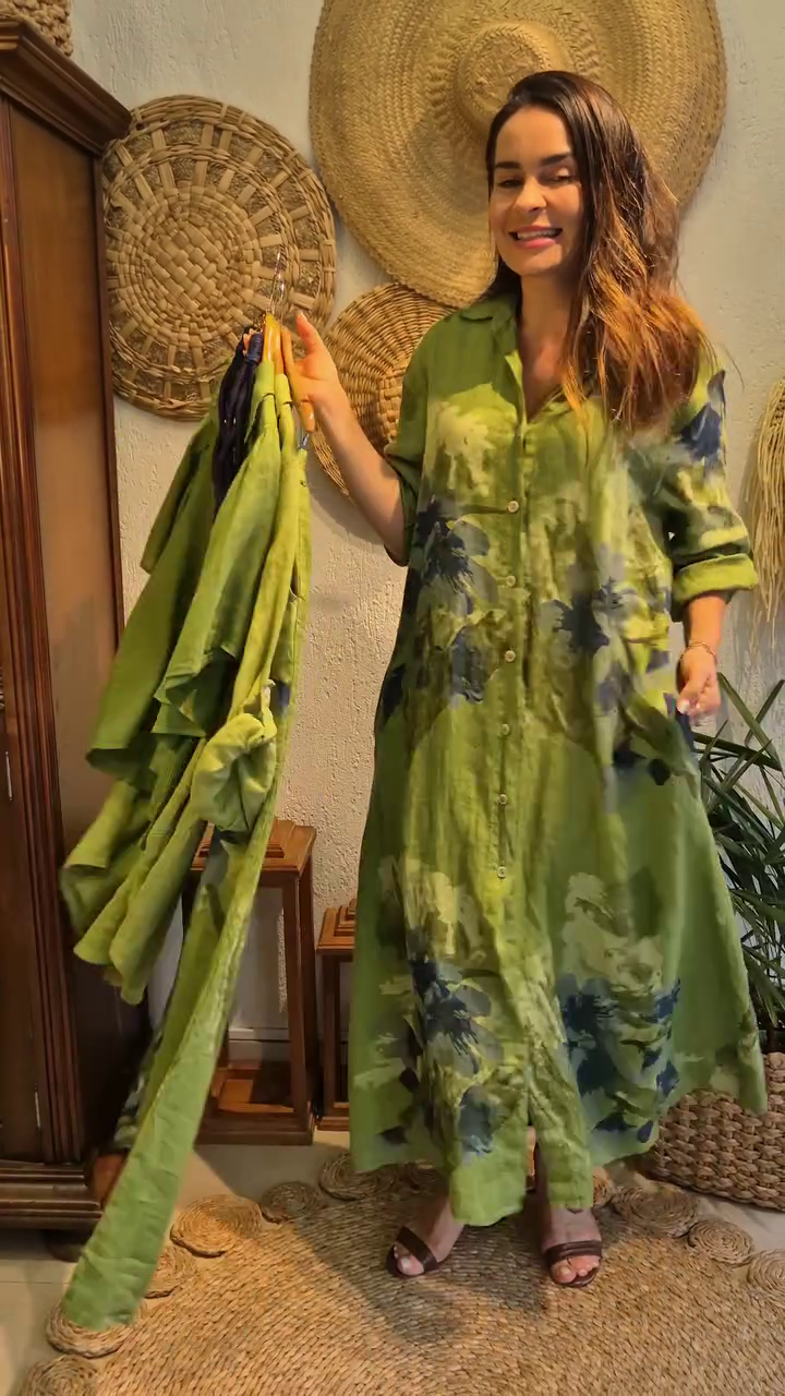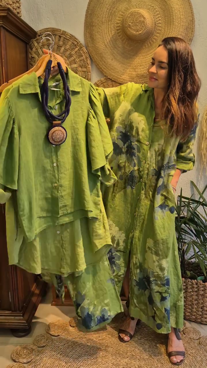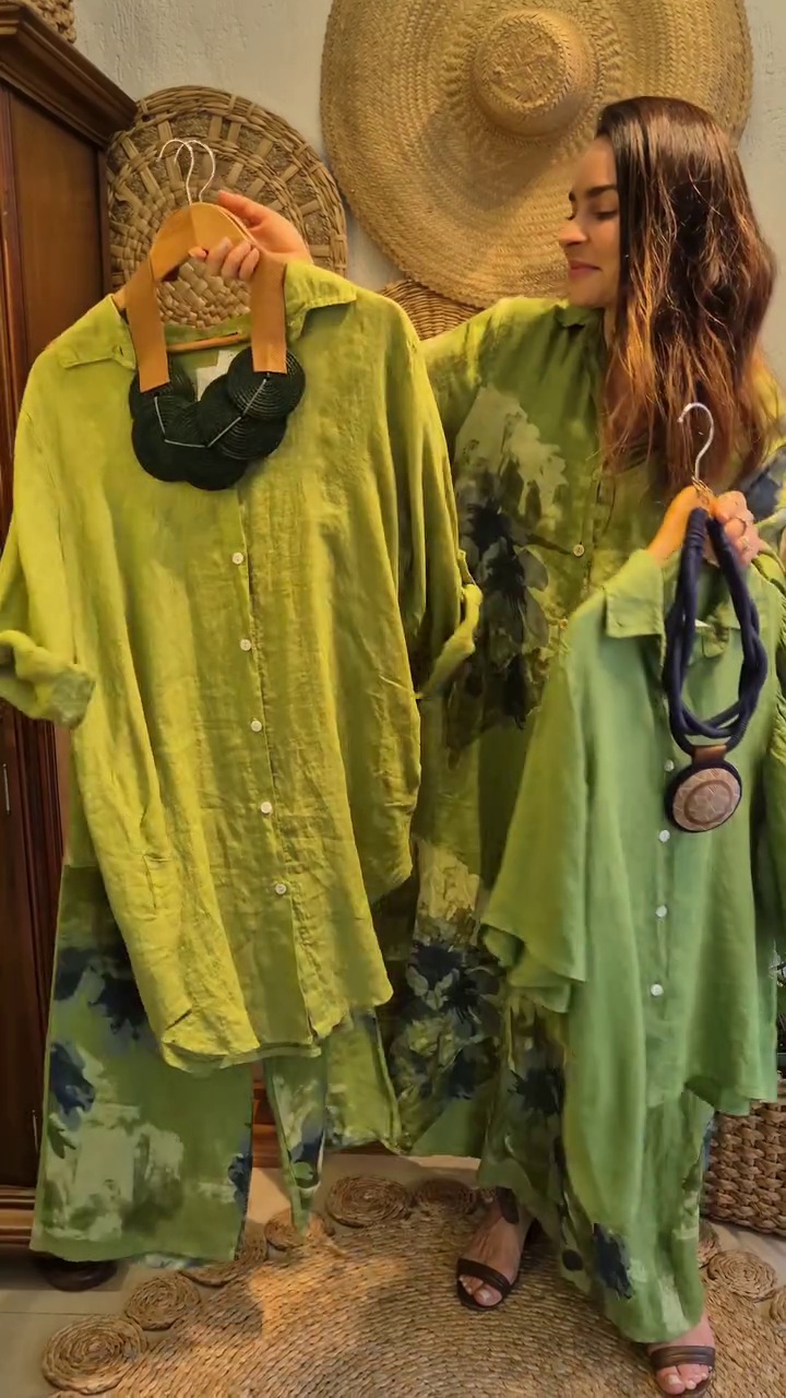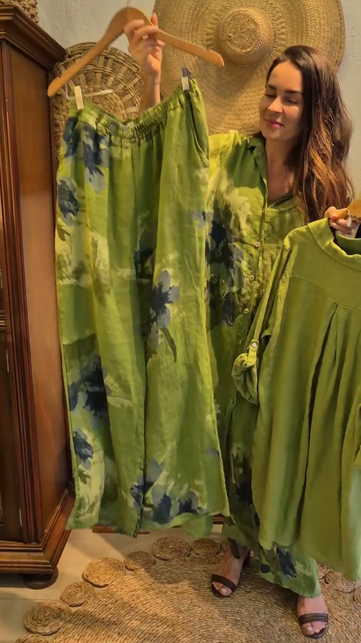 The look features a relaxed button-down shirt in a fresh olive hue, paired with matching wide-leg trousers adorned with oversized watercolor-style floral prints in deep blue tones. The fluid print creates a striking contrast against the green base, adding depth and artistic appeal without overwhelming the design.
