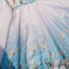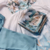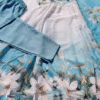 Crafted from premium soft organza silk, the outfit features a lightweight, airy texture that drapes beautifully while adding subtle sheen and movement. The aqua blue shade evokes freshness and tranquility, providing a flattering and eye-catching base for the intricate floral print. The delicate floral patterns are artistically placed, enhancing the overall aesthetic while maintaining a balanced, elegant appearance.