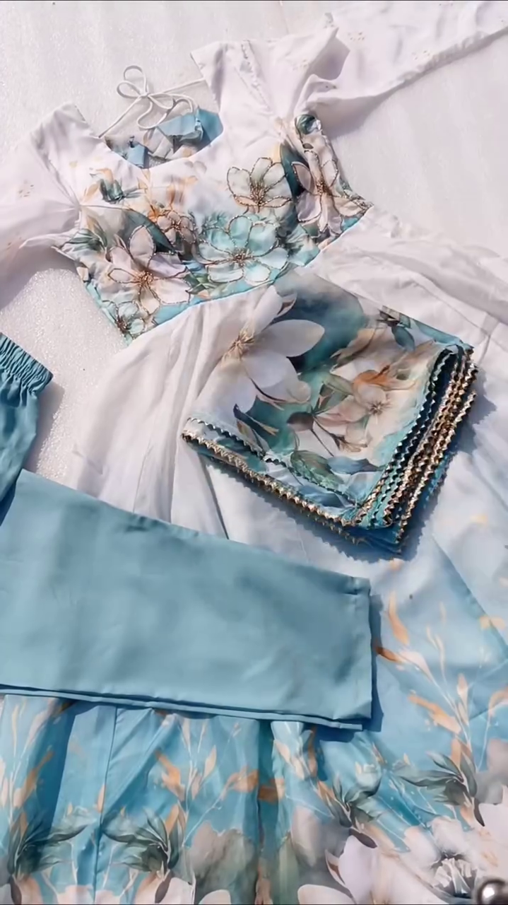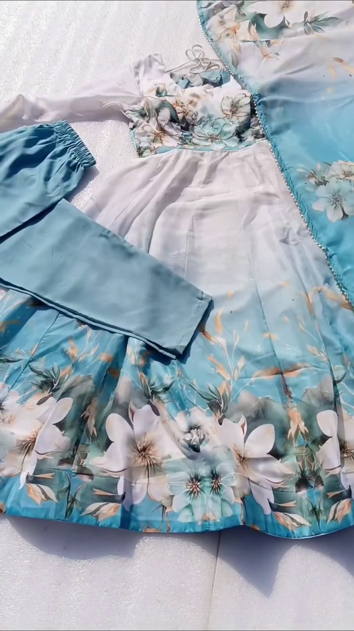 For those seeking a perfect blend of tradition, elegance, and contemporary fashion, the Aqua Blue Soft Organza Silk Floral Print Fully Flared Anarkali Pant with Dupatta Set is an ideal choice. Itβs more than just attireβitβs an experience of grace, color, and celebration in every step.