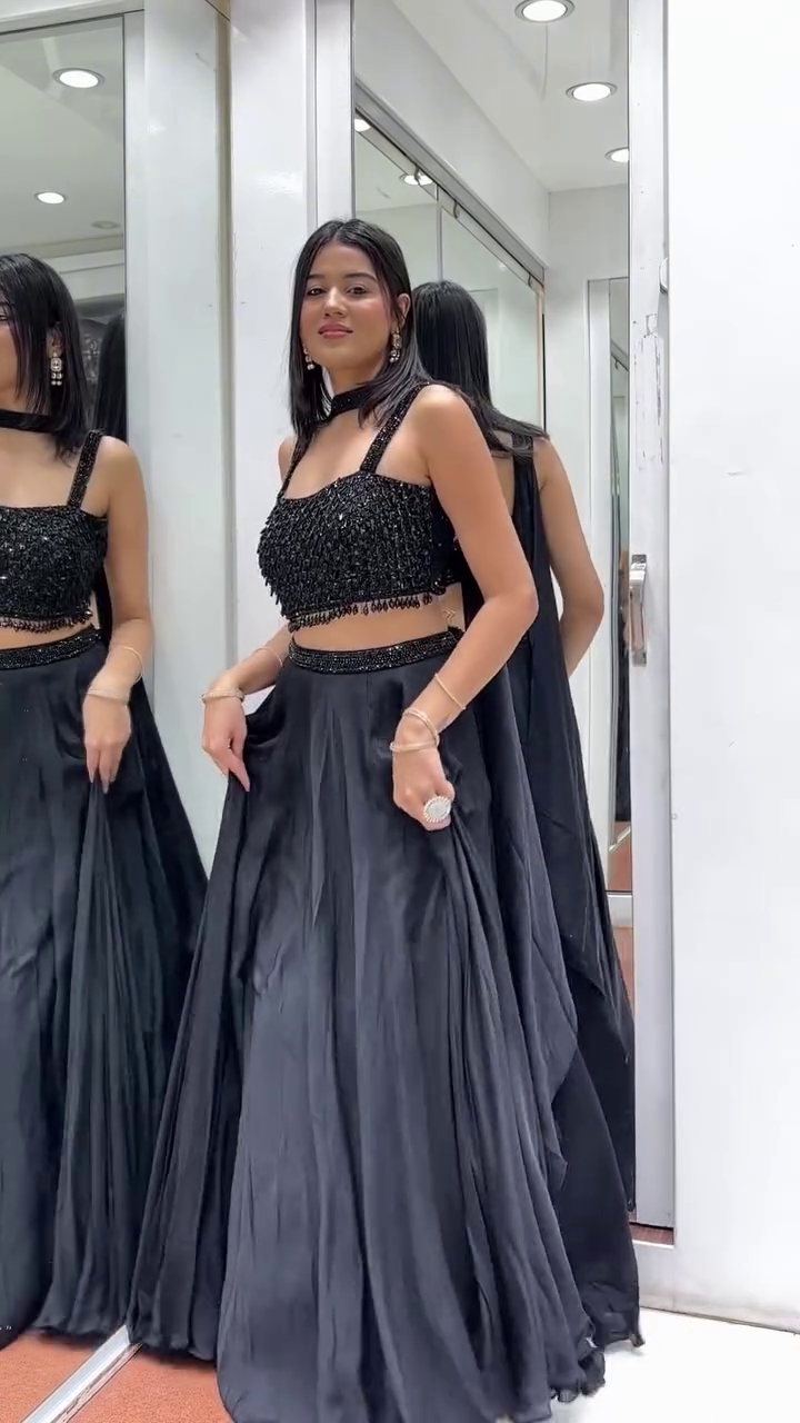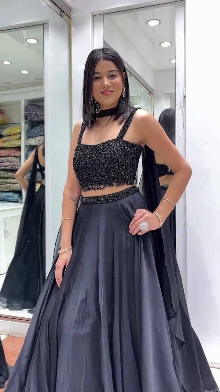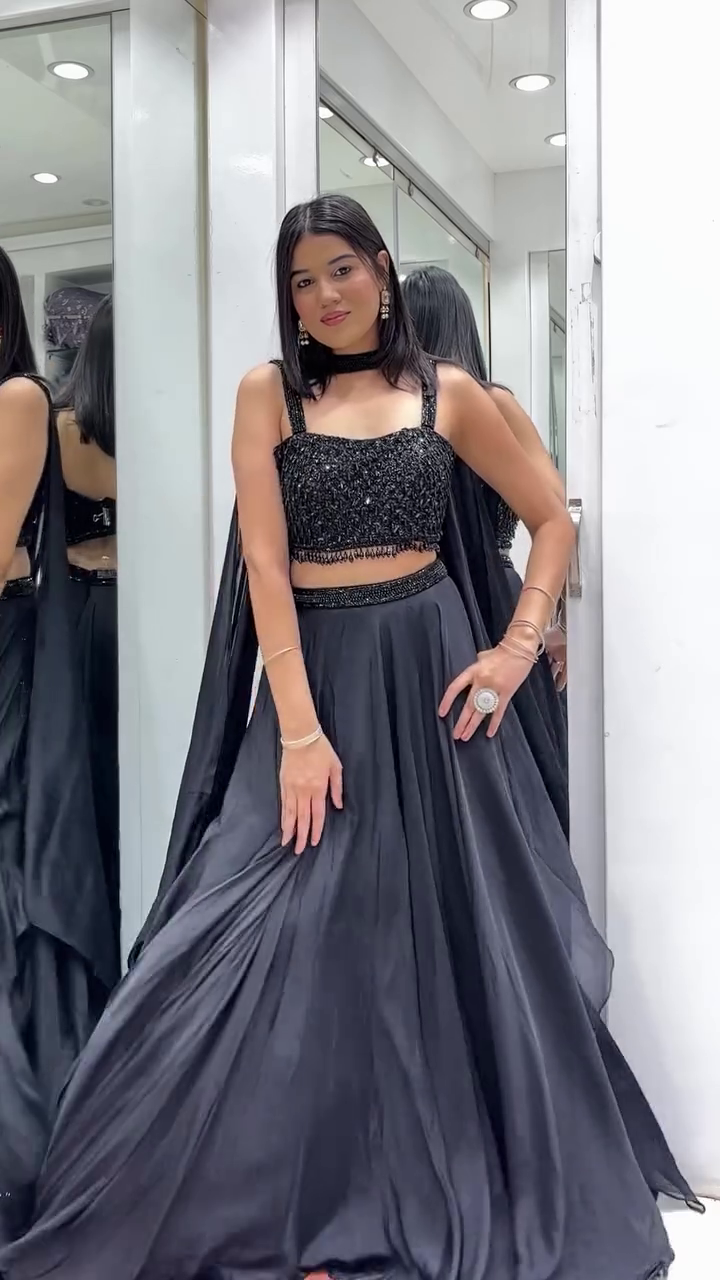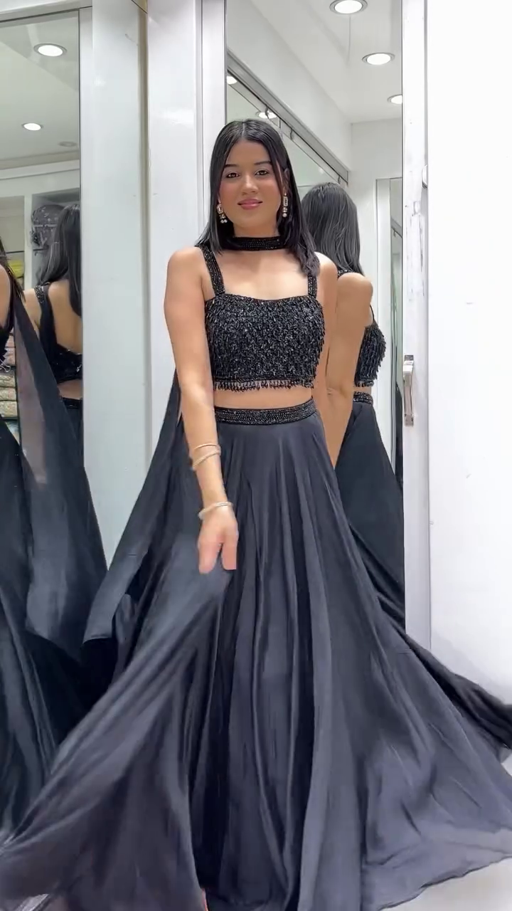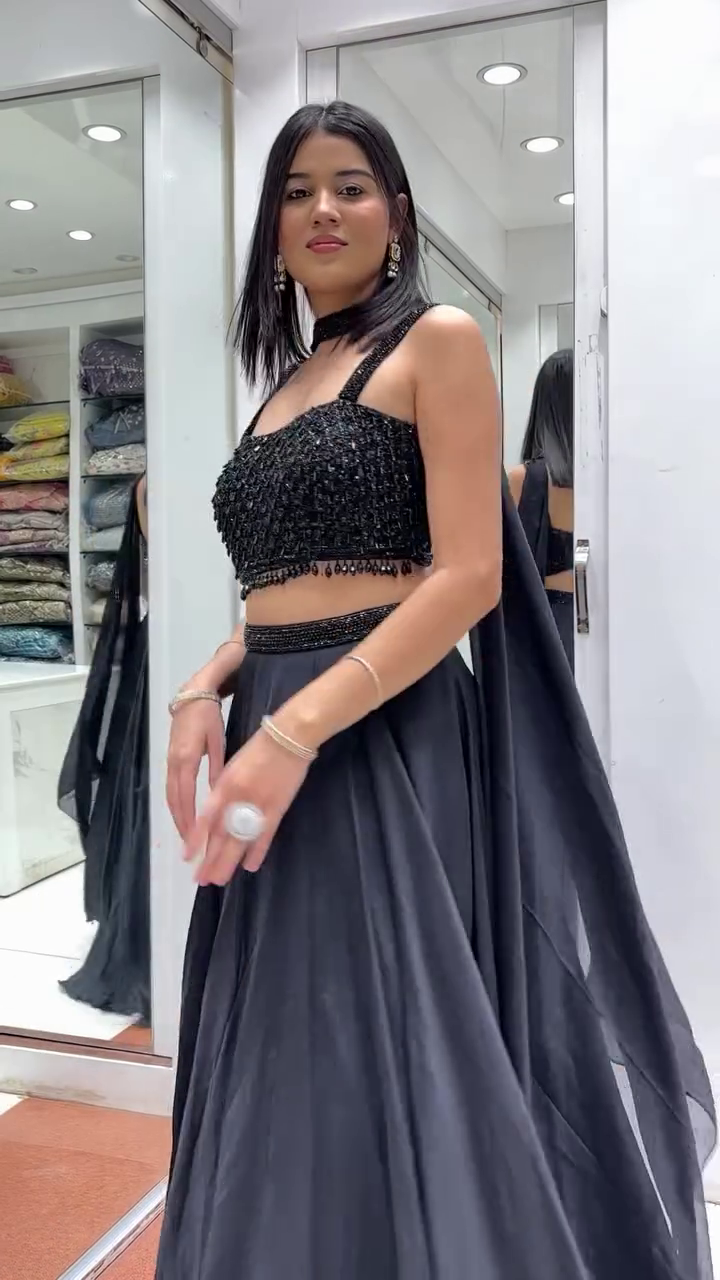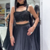 The Rich, Deep Black Colour Exudes Class And Power, Making You Stand Out With Confidence And Sophistication. The Entire Lehenga Is Embellished With Shimmering All-Over Sequin Work, Designed To Catch The Light From Every Angle β A Glamorous Choice For Evening Celebrations And Fashion-Forward Bridesmaids.