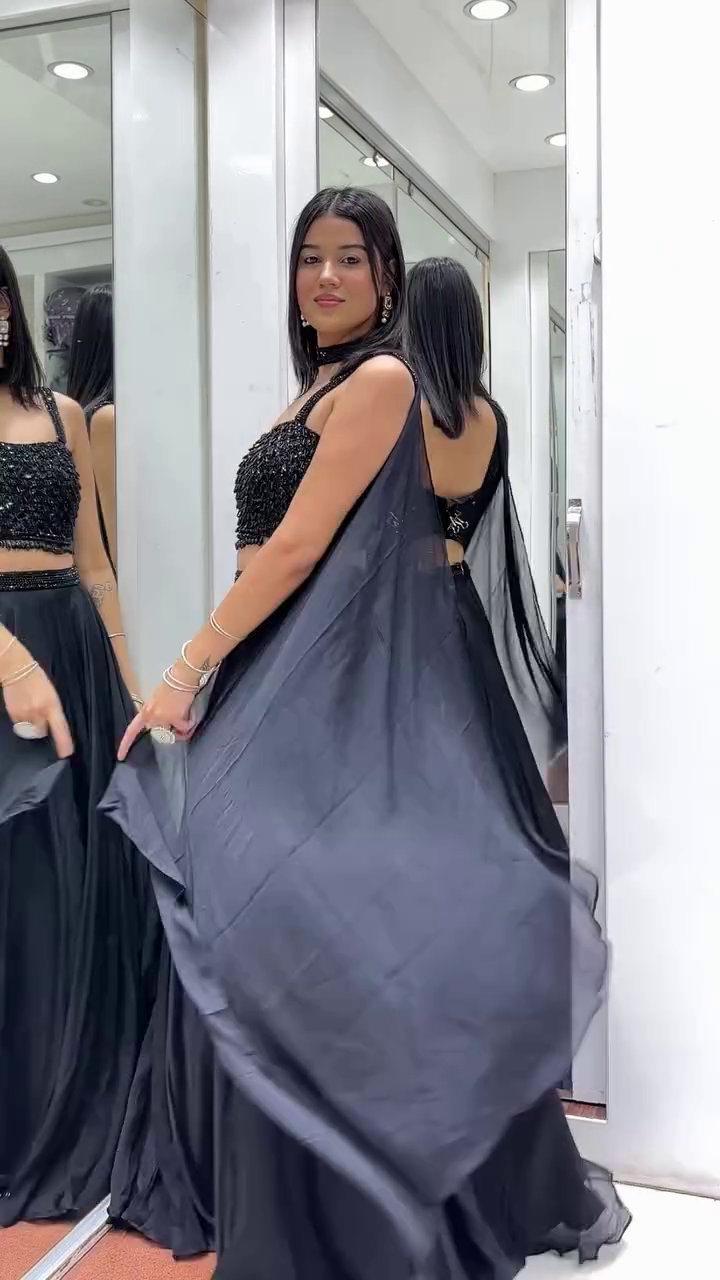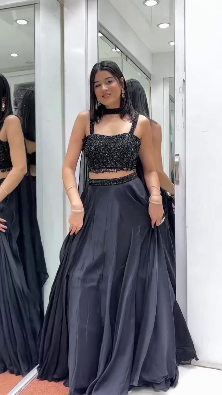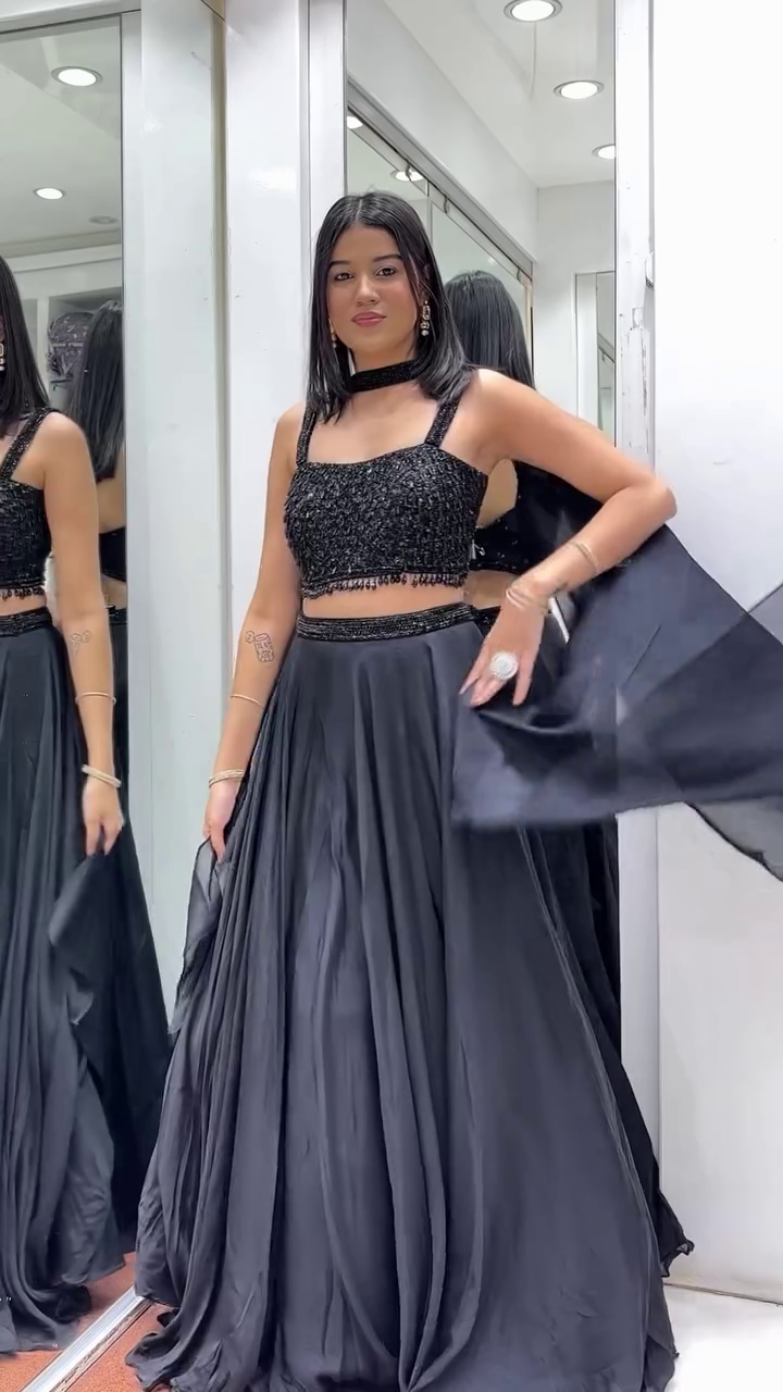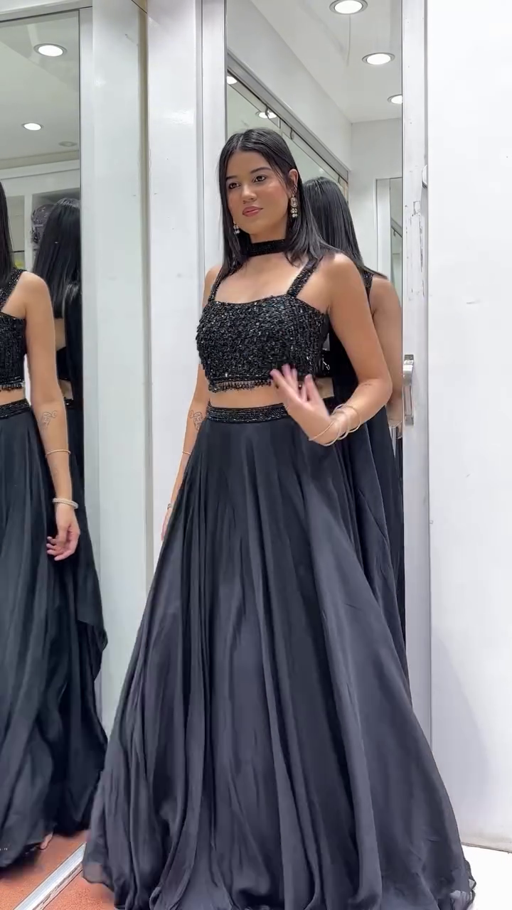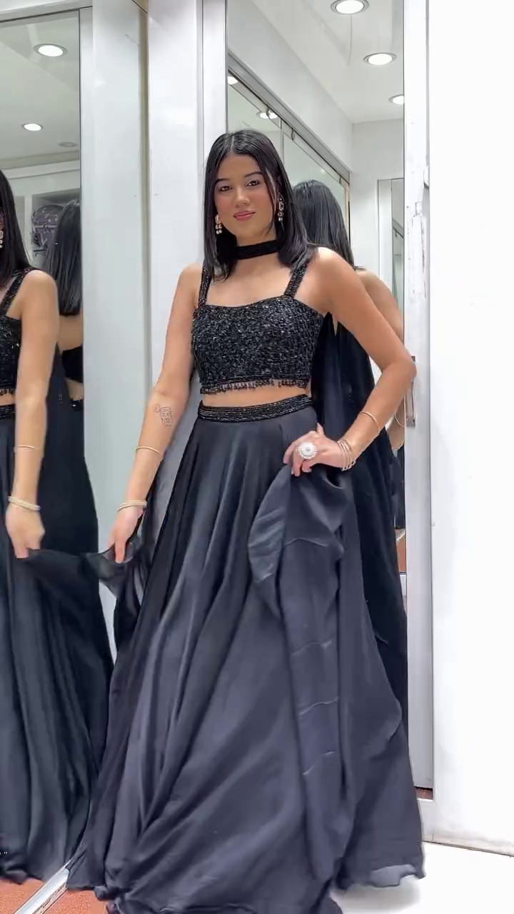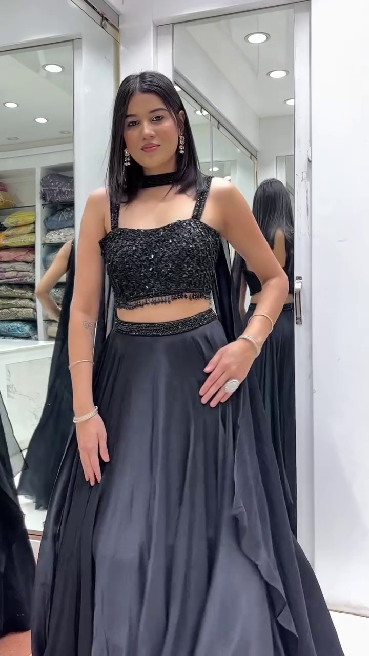 The Rich, Deep Black Colour Exudes Class And Power, Making You Stand Out With Confidence And Sophistication. The Entire Lehenga Is Embellished With Shimmering All-Over Sequin Work, Designed To Catch The Light From Every Angle β A Glamorous Choice For Evening Celebrations And Fashion-Forward Bridesmaids.