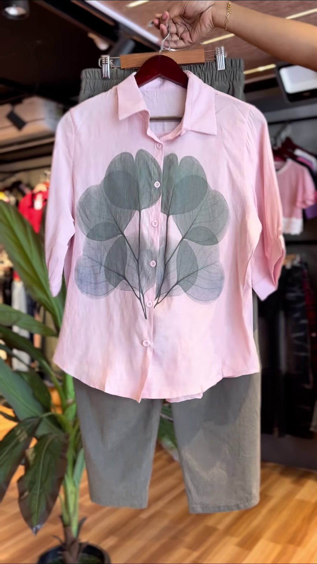 Bring the outside in with the Botanic Breeze Coord Set, featuring a dreamy pastel pink shirt adorned with a graceful leaf print and paired with muted sage green shorts for a relaxed yet refined look.