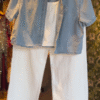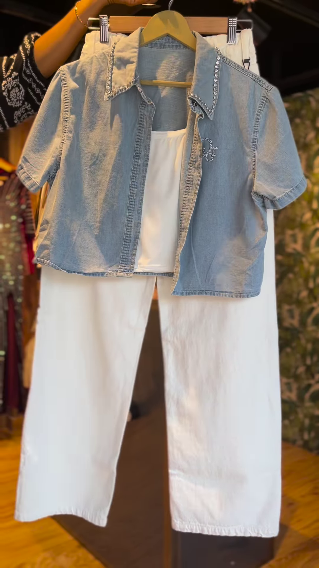 This look is the ultimate expression of laid-back glam with a touch of sass! The short-sleeved, light-wash denim shirt is a total statement piece with its embellished collar that adds just the right amount of sparkle. It’s got that “I didn’t try too hard, but still slaying” vibe. Open front styling with a soft white inner top keeps the overall look breezy and breathable – exactly what you need for sunny days or a casual outing with the squad.