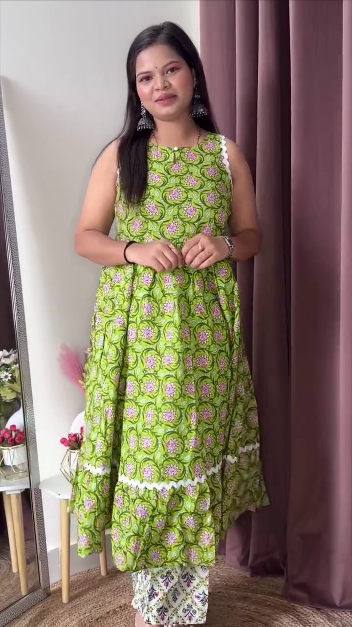 Bring a breath of fresh style into your wardrobe with this stunning green ethnic outfit that beautifully captures the essence of vibrancy, femininity, and comfort. 💚🌸 This look is perfect for those who love playful prints combined with graceful silhouettes, making it an ideal pick for both casual gatherings and festive moments.