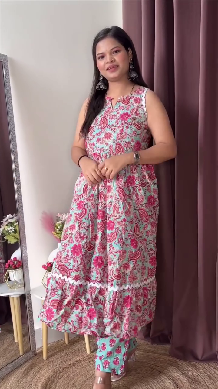 The silhouette is flowy and layered, designed to offer both style and comfort. The sleeveless kurta features a relaxed fit that drapes gracefully, making it flattering for various body types. The layered hemline adds movement and a playful touch, making every step feel light and elegant. 👗