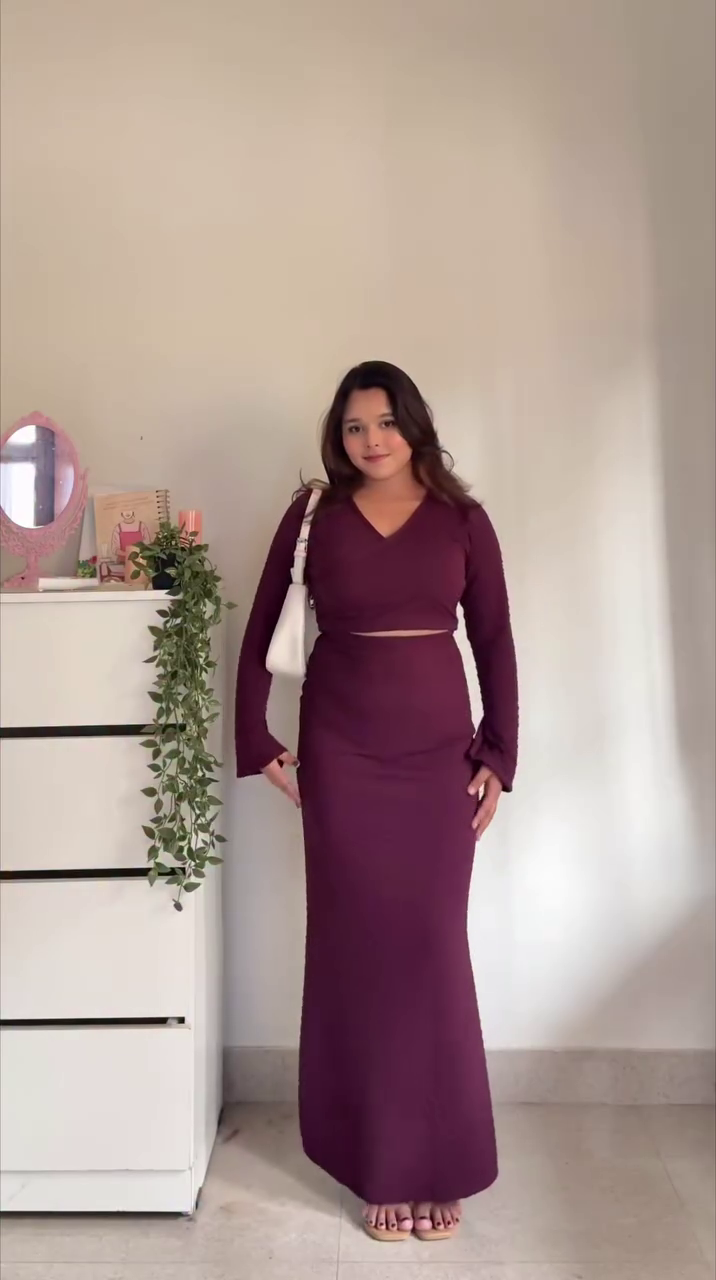 Elevate your fashion game with the wine-colored co-ord set featuring a V-neck crop top and matching long skirt—because every woman deserves to feel beautiful, confident, and effortlessly chic. 🍷💃