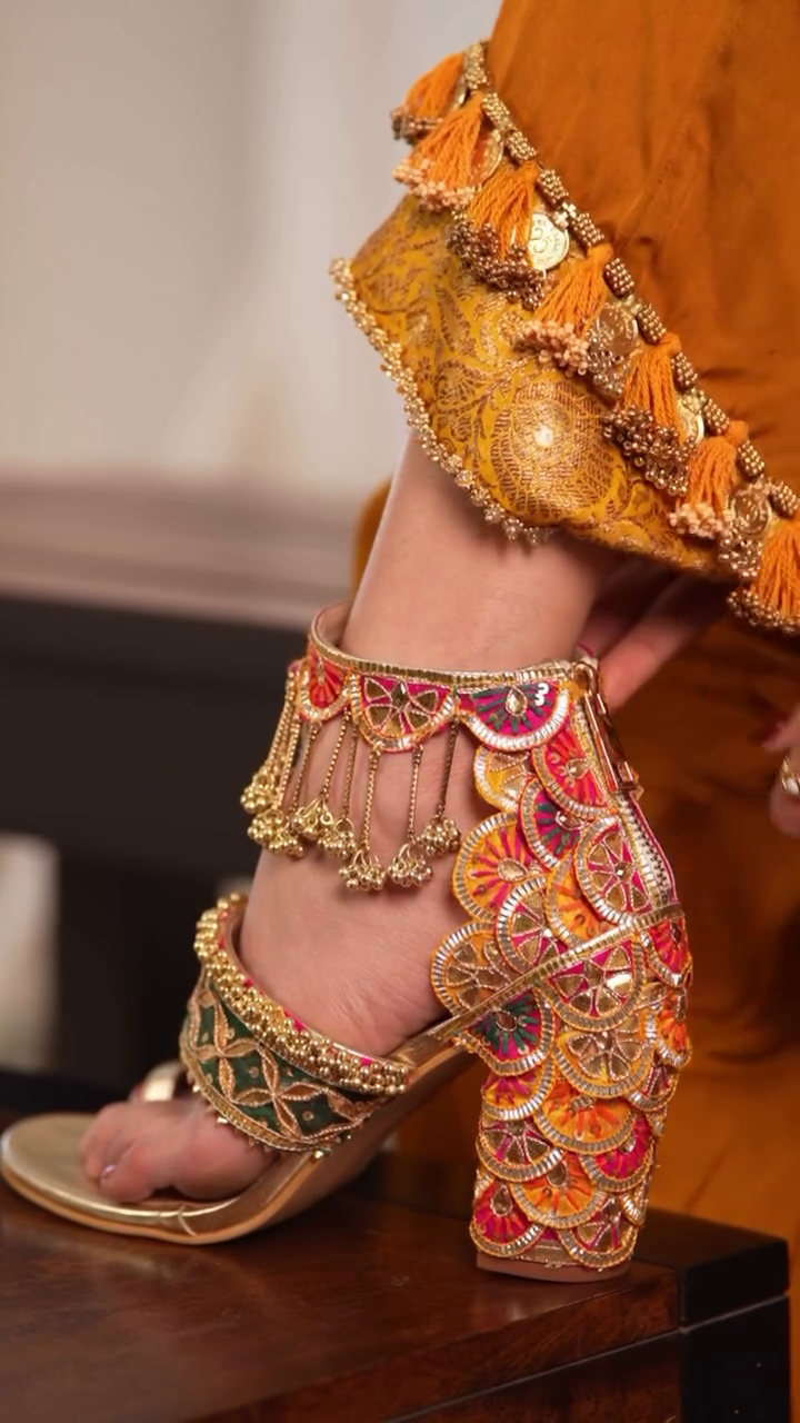 From a styling perspective, these heels are incredibly versatile. Pair them with lehengas, sarees, shararas, or even Indo-western outfits like cape sets or fusion dresses. Gold and beige tones give a regal feel, while deeper hues like maroon or emerald add a bold festive touch.