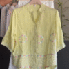 The shirt features delicate embroidery and subtle embellishments that enhance its visual appeal without overpowering the design. Small shimmering accents and vertical detailing add texture and depth to the fabric. Additionally, circular embroidered motifs with soft pastel color accents create a unique artistic element across the front of the shirt. These design details give the shirt a handcrafted feel, reflecting thoughtful attention to design and creativity.