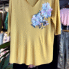 Say hello to laid-back charm with our Golden Bloom Set. The mustard-yellow ribbed top features a relaxed polo collar and an eye-catching hand-painted floral cluster that brings a fresh, feminine flair. Paired with sleek black cropped pants, it’s an effortless blend of comfort and creativity – perfect for weekend strolls or casual coffee catchups.