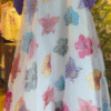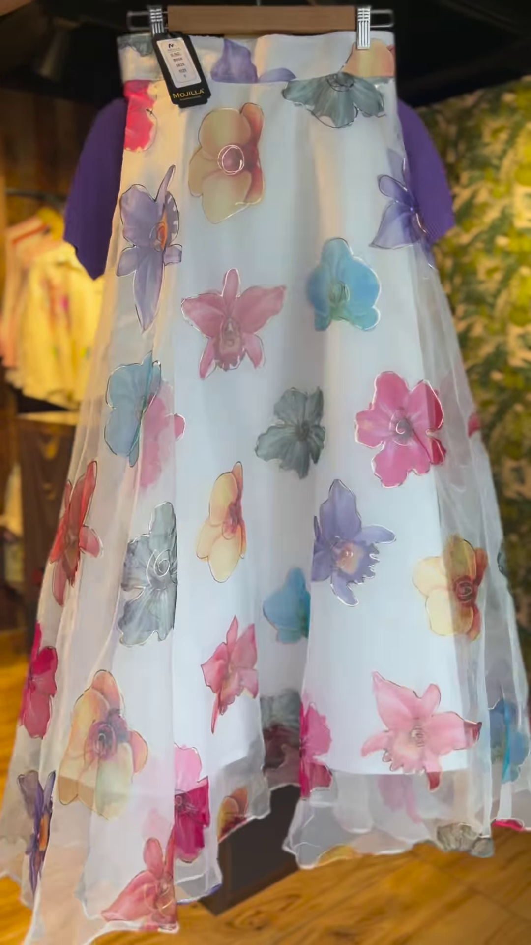 Skirt Fabric: Sheer organza overlay with multicolored floral print + inner lining