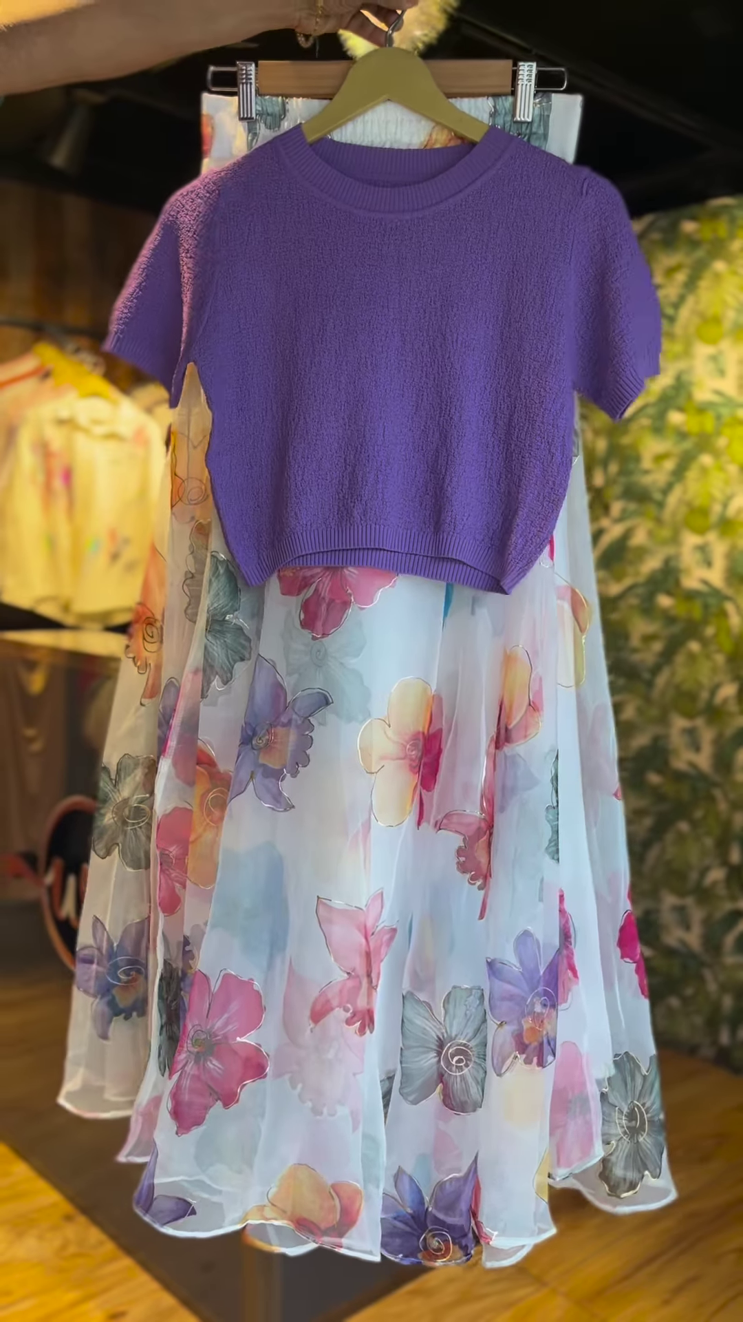 The top is made of soft, cozy knit that hugs gently while the skirt twirls with every step, thanks to its airy organza layer adorned with watercolor-style floral prints. The flowers pop in hues of pink, blue, peach, and purpleโgiving you that soft girl aesthetic with a bold fashion twist.