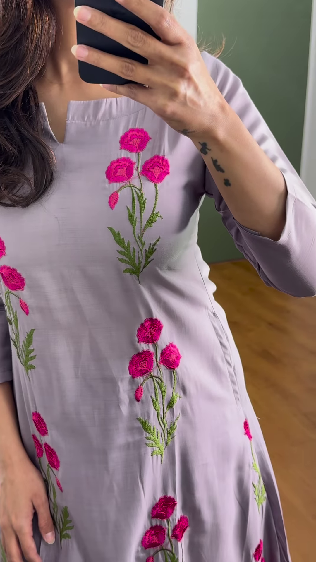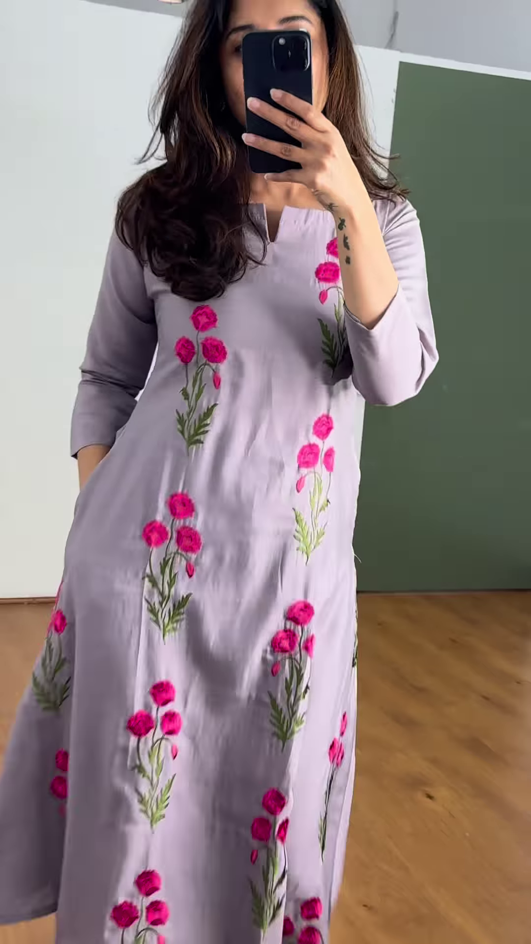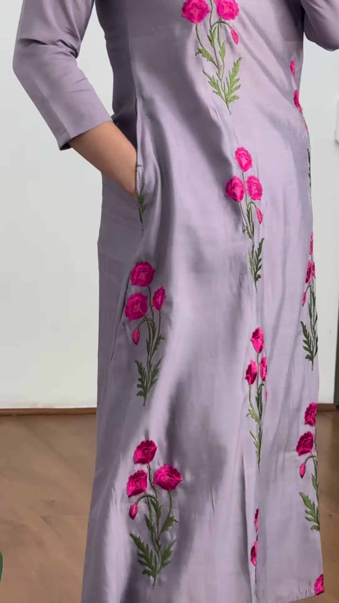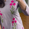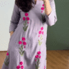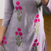 Embrace timeless elegance with this lavender embroidered kurti, a perfect blend of traditional charm and contemporary grace. Crafted from a smooth and flowy fabric that feels luxurious on the skin, this kurti features exquisite hot pink floral thread embroidery that runs vertically—adding a pop of vibrant color to a soft pastel base.