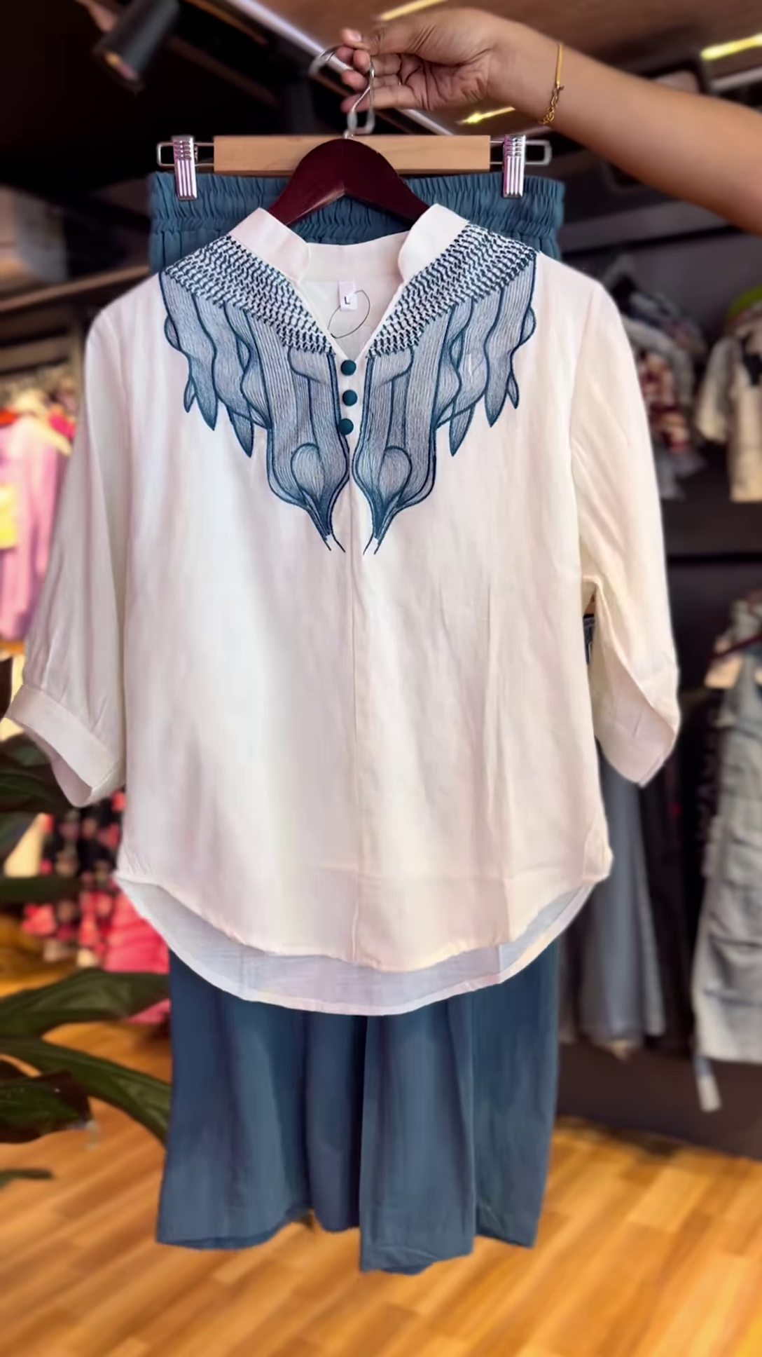 Classic elegance meets a bold twist in our Midnight Mist Ensemble. Featuring an ivory high-low kurta adorned with intricate teal embroidery and buttons at the neckline, this look is all about subtle drama. Paired with soft teal trousers, it creates a statement without saying a word. Breezy, beautiful, and effortlessly put together.