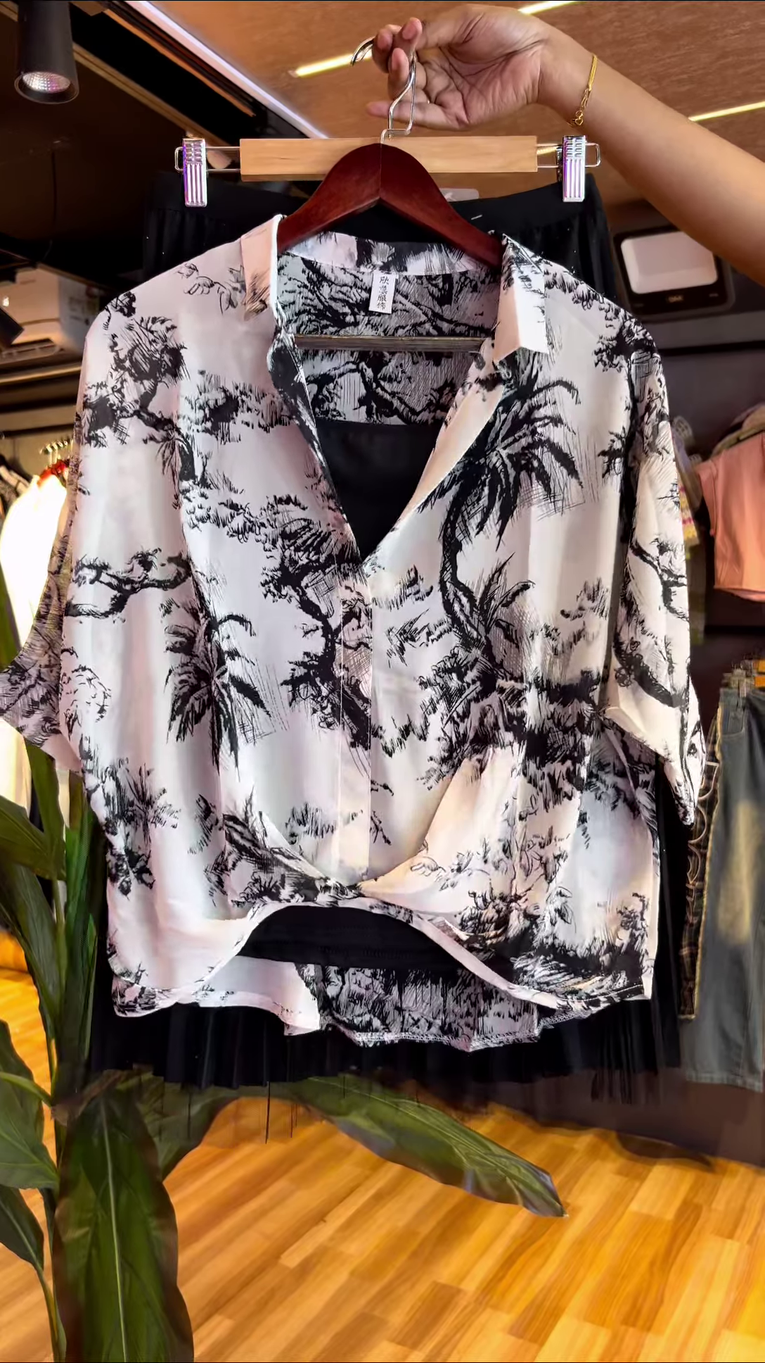 This dreamy black & white tropical shirt is the definition of “I’m on island time but still stylish AF.” Paired with that flowy black pleated skirt and a subtle black tank underneath, it’s laidback luxury with a hint of drama.