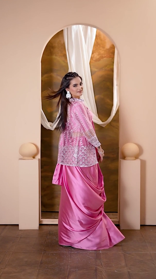 Elevate your festive and party look with this Pink Designer Soft Silk Ready-to-Wear Saree. Designed for elegance and comfort, this saree is crafted from premium soft silk fabric, giving it a luxurious feel with a graceful drape. The solid pink color adds a touch of sophistication, making it a perfect choice for special occasions.