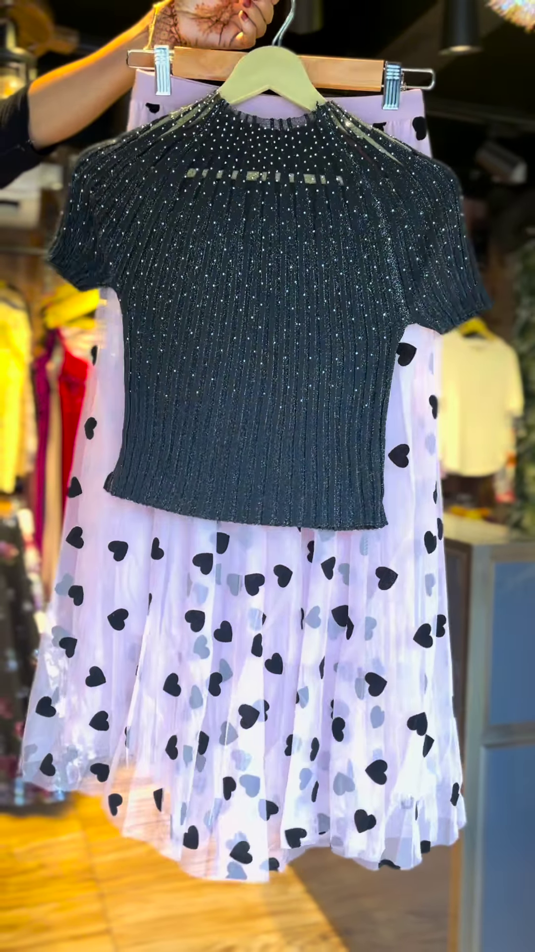 Step into the spotlight with this playful yet elegant co-ord set featuring a glittery black ribbed knit top and a dreamy lavender skirt with bold black heart prints. Whether you’re heading to a casual party, birthday bash, or just a fun day out, this outfit brings together charm, comfort, and style.