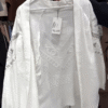 Set: Three-piece white co-ord (embroidered inner blouse, flowy outer jacket, and wide-leg pants)