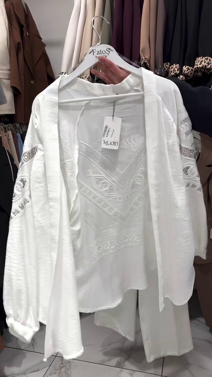 Bu beyaz üçlü takım, sadeliği ve zarafeti bir araya getiriyor.